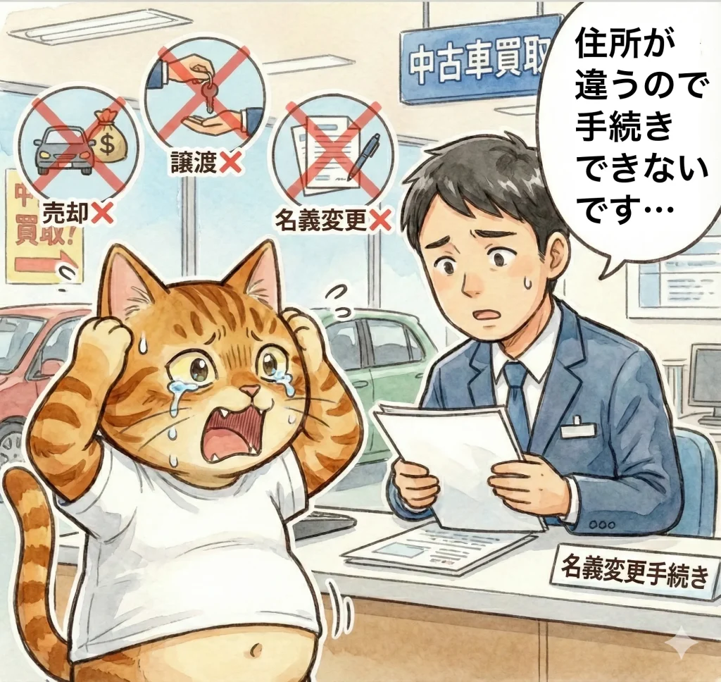 特に、買取業者、ディーラー、個人売買では、「住所変更が終わってからじゃないと進められません」と、ほぼ確実に言われます。