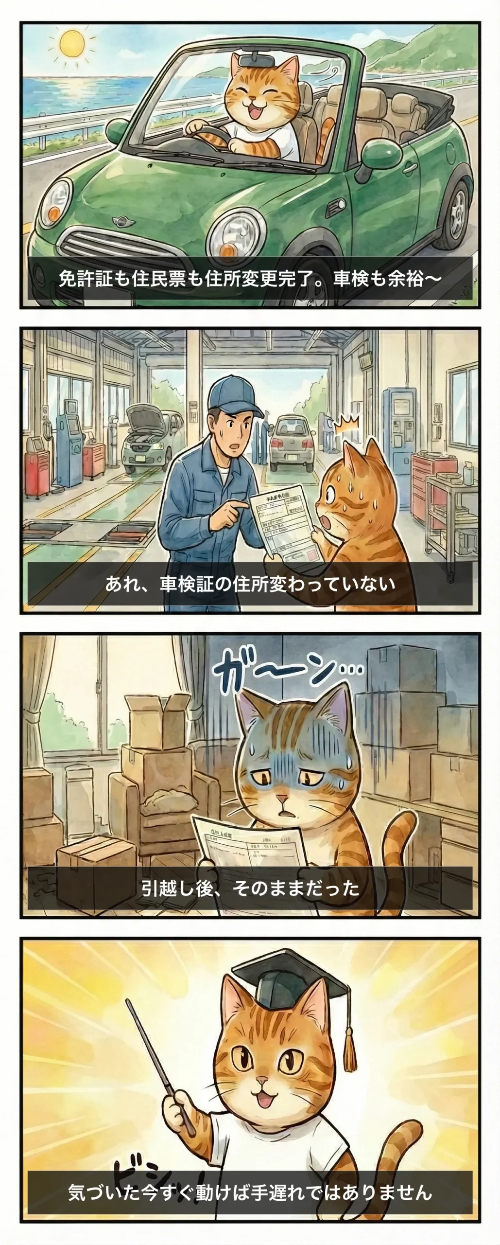 ここまでの話をまとめると、すぐに罰金になることは少ない、でも放置すると別のところで必ず詰まる、しかもそのタイミングはだいたい「急いでいるとき」、というのが車検証の住所変更あるあるです。