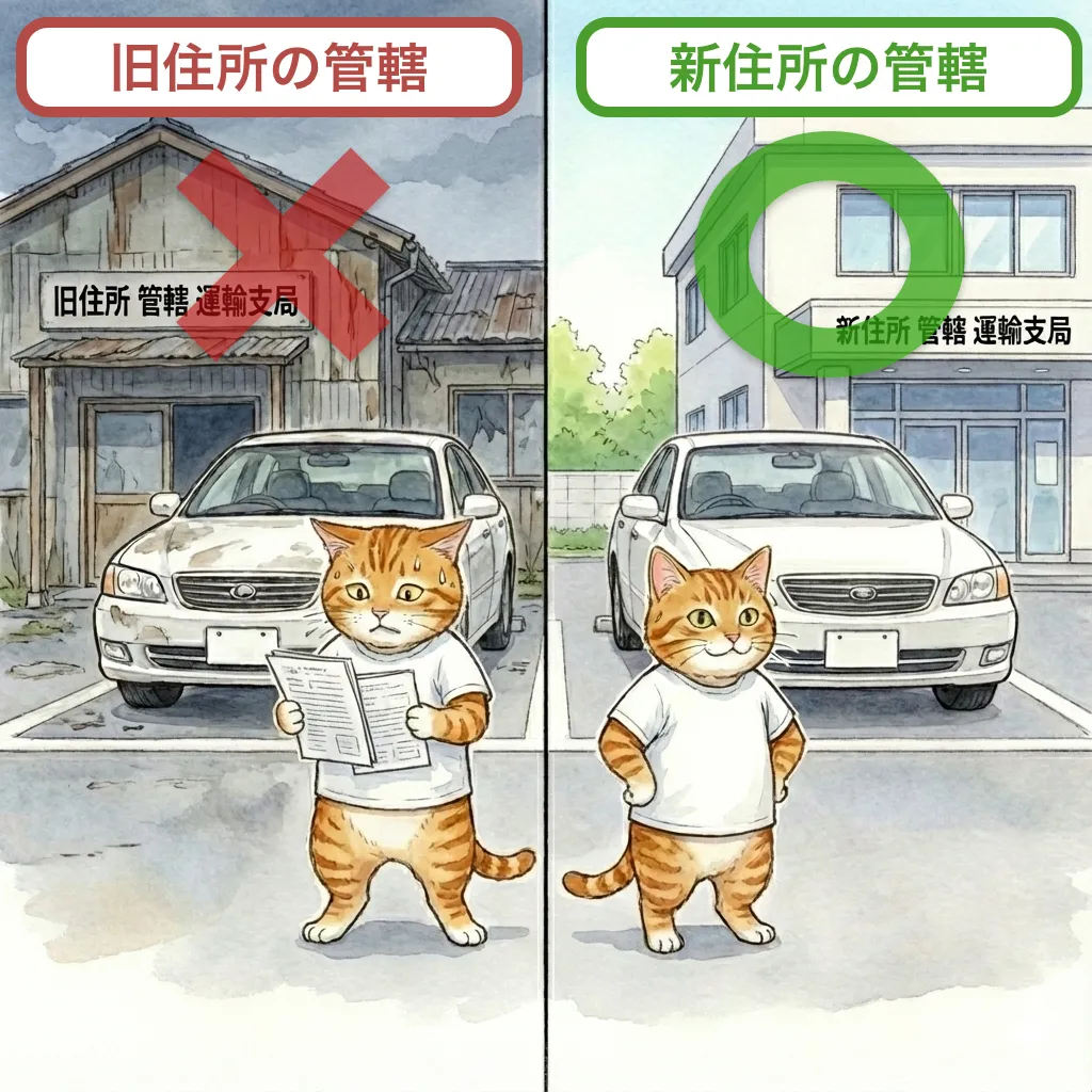 基本的な考え方はシンプルで、車の使用の本拠が変わり、新住所が「別の管轄」になる場合です。